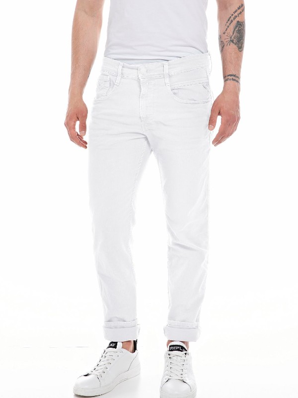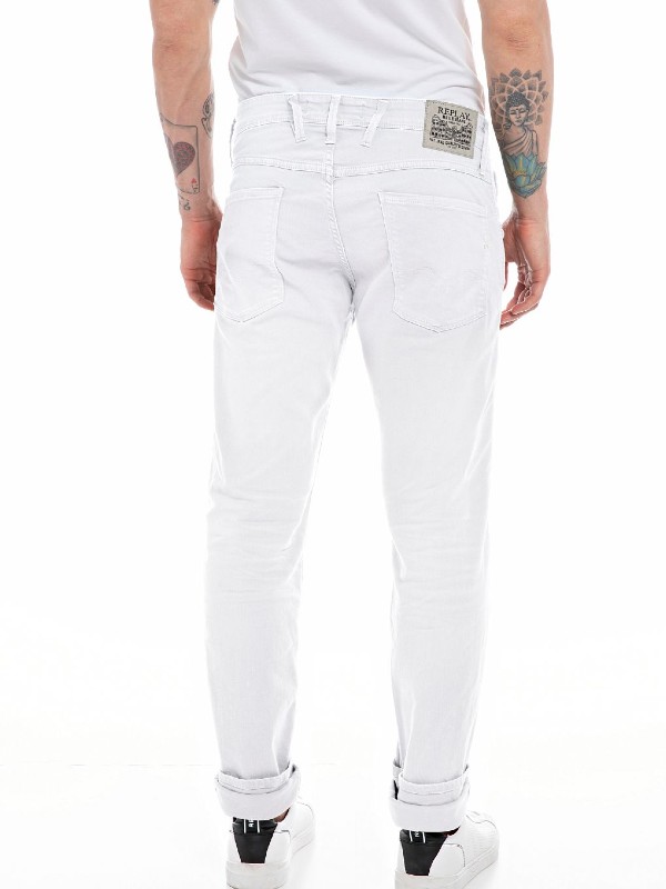 Κλείσιμο με κουμπί, Κλασικές πέντε τσέπες, Κανονική μέση, στενή εφαρμογή στο πόδι, Ελαστικό βαμβακερό jean, Λογότυπο στο πίσω μέρος.
